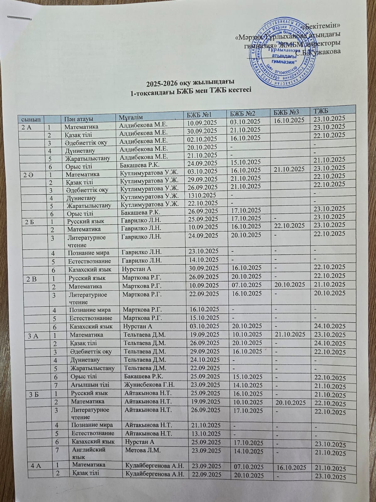 2025-2026 оқу жылындағы 1-тоқсандық БЖБ мен ТЖБ кестесі
